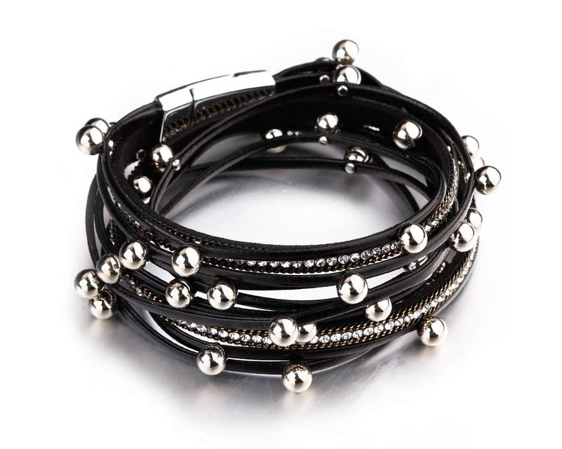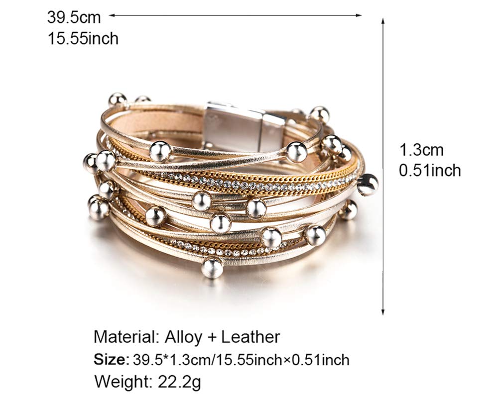 • 【UNIQUE DESIGN】 This women leather bracelet features multilayer leather cord and combination with small steel balls and rhinestones. It is made of a strong high-quality alloy magnetic clasp so as to easy wear and take off.